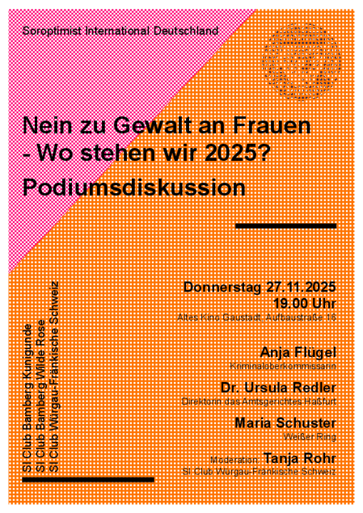 Als Gemeinschaftsveranstaltung der drei Soroptimist International Clubs Bamberg Kunigunde, Bamberg Wilde Rose und Würgau-Fränkische Schweiz laden wir herzlich zur Podiumsdiskussion ein: